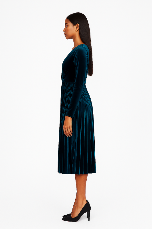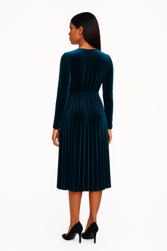 "Women's Peacock Green Velvet Western Dress – Knee-Length with Half Sleeves and V-Neckline, Soft & Elegant for Evening or Party Wear"